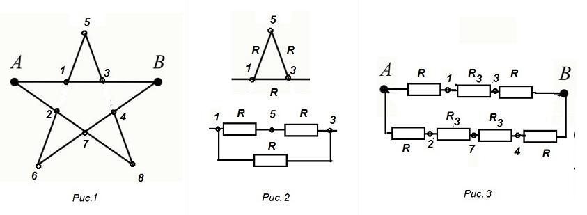 Рассмотрим "луч" звездочки. Мы видим, что 2 последовательно соединенных резистора подключены параллельно к третьему (См. рис.
