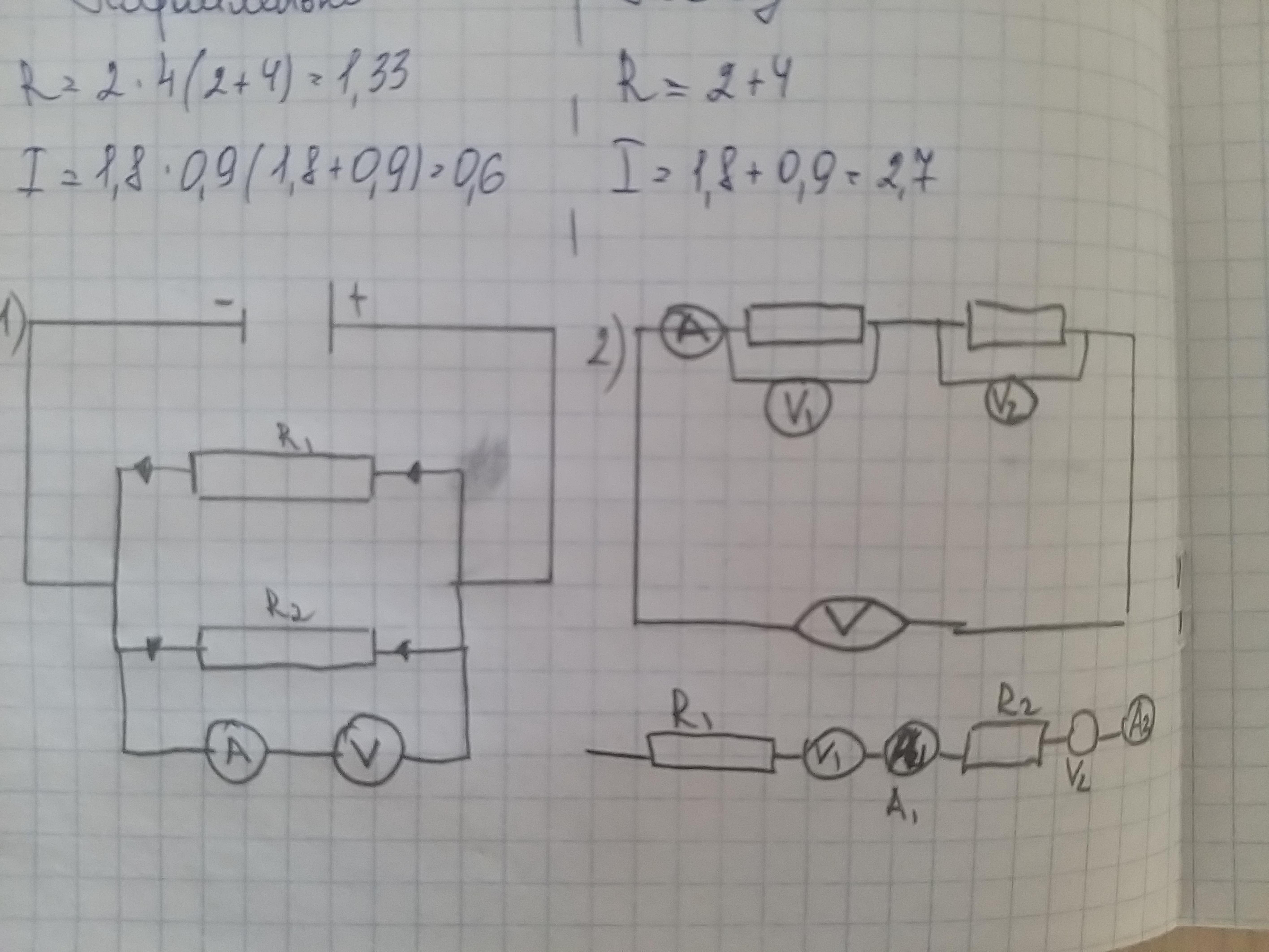 равны 2 и 4 Ом. Определите общее сопротивление участка и силу тока в каждом резисторе при их последовательном и параллельном соединении. Начертите схемы электрических цепей.