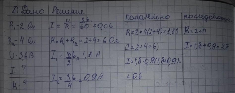 равны 2 и 4 Ом. Определите общее сопротивление участка и силу тока в каждом резисторе при их последовательном и параллельном соединении. Начертите схемы электрических цепей.
