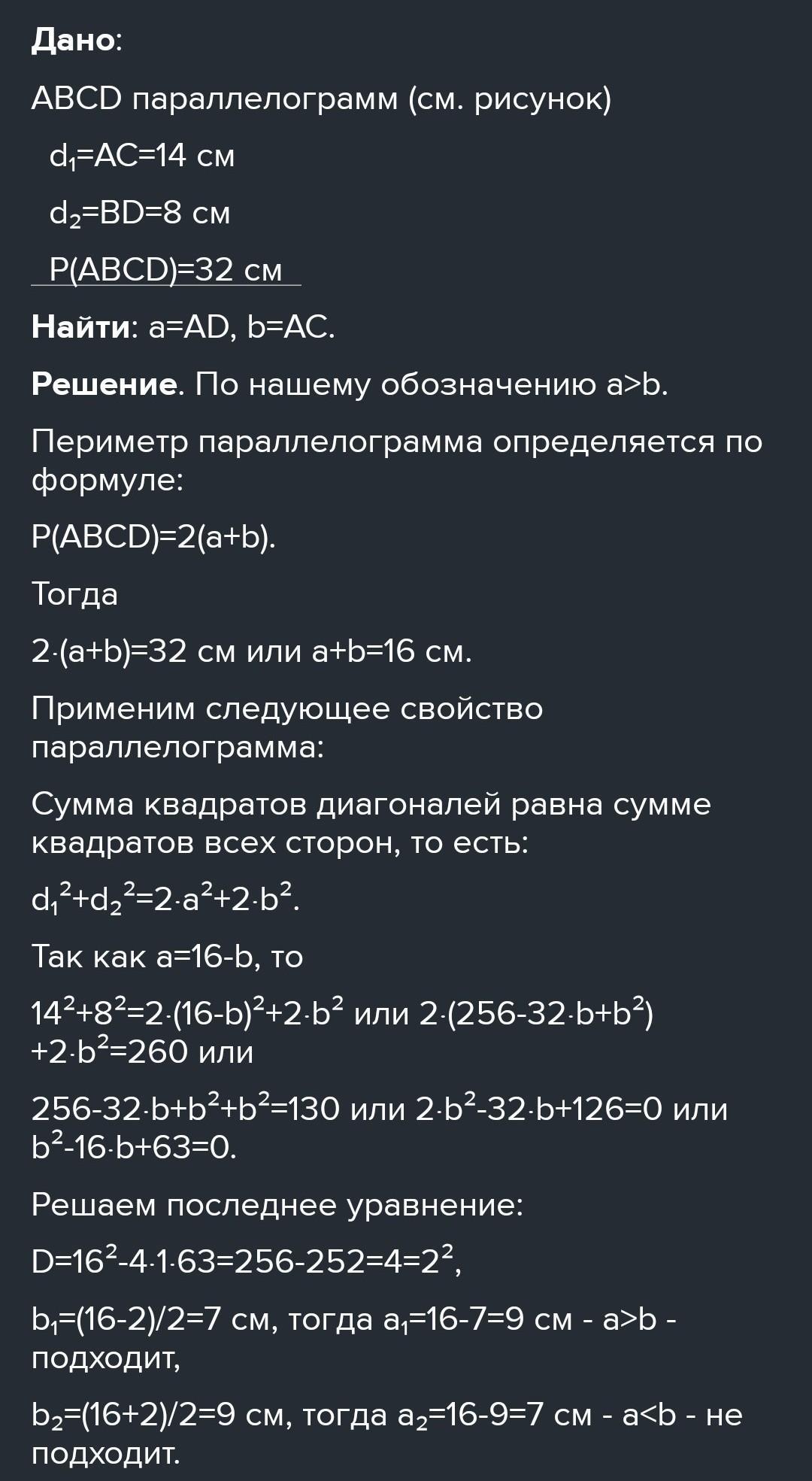 4. Диагонами параллелограмма равны 14 см и 8 см, а пе-