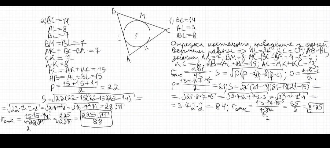5. В треугольнике одна из сторон равна 14см, а другая сторона делится точкой касания вписанной окружности на отрезки 8 см и 7см, найдите радиус окружности описанной около треугольника