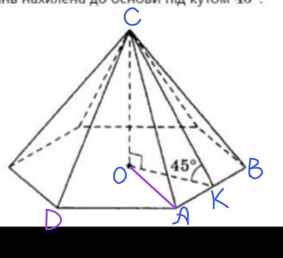СК и ОК – перпендикуляры, лежащие на боковой грани АСВ и основании пирамиды соответственно.