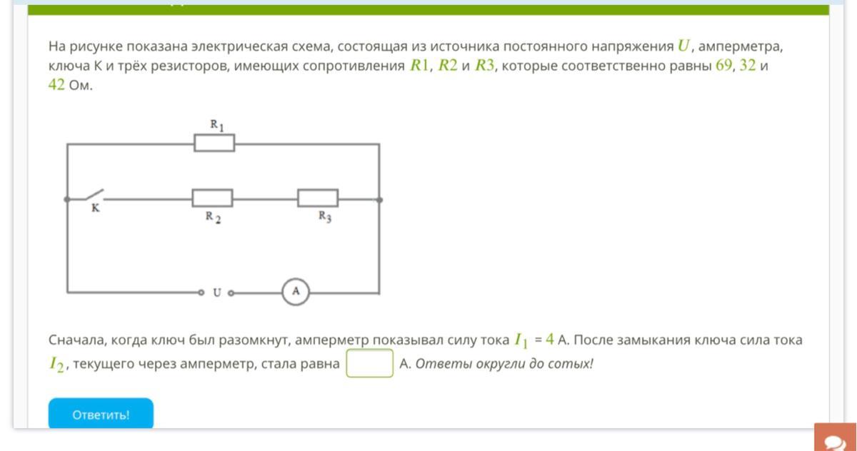 На рисунке показана электрическая схема, состоящая из источника постоянного напряжения , амперметра, ключа К и трёх резисторов, имеющих сопротивления 1, 2 и 3, которые соответственно равны 69, 32 и 42 Ом.