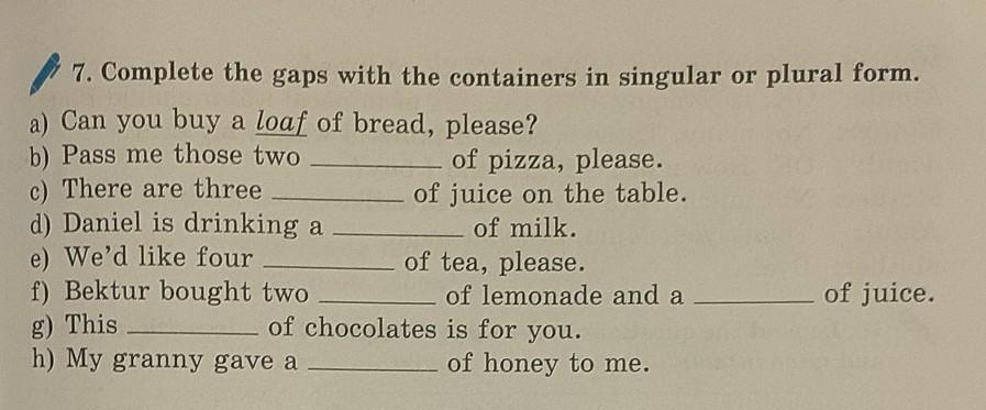 b)pieces c) cartons/glasses d) glass e)cups f)bottles..cartons g)boxes h)jar