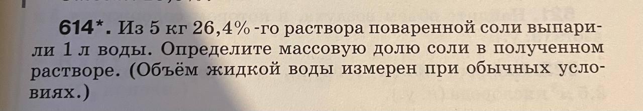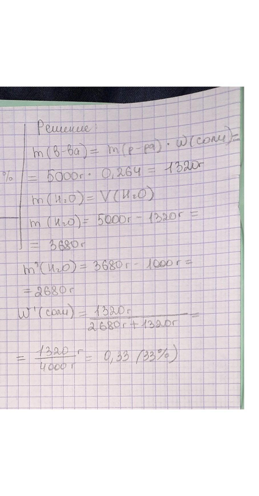 Из 5 кг 26,4% -го раствора поваренной соли выпаривали 1 л воды. Определите массовую долю соли в полученном растворе. (Объём жидкой воды измерен при обычных условиях)