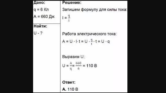 При прохождении по проводнику электрического заряда, равного 6 Кл совершается работа 660 Дж. Чему равно напряжение на концам этого проводника?