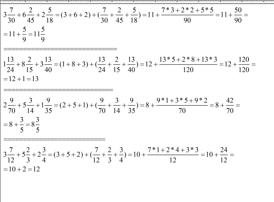 выполните сложение: 1) 3 7/30 +6 2/45 +2 5/18 2) 1 13/24 +8 2/15 +3 13/40 3) 2 9/70 +5 3/14 +1 9/35 4) 3 7/12 +5 2/3 +2 3/4