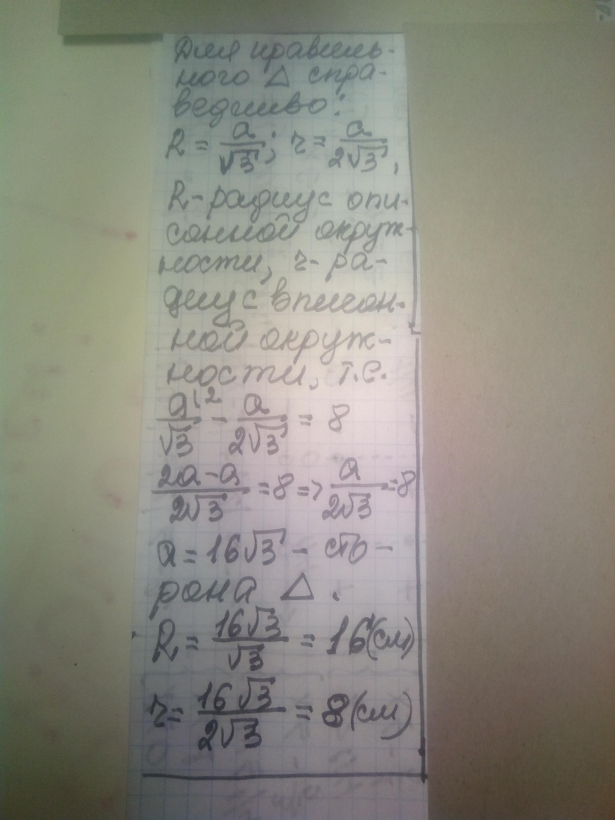 помогите пожалуйста, нужно найти радіуси описаного і вписаного кіл правильного трикутника якщо їх різниця дорівнює 8 см