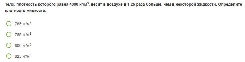Тело, плотность которого равна 4000кг/м в кубе, весит в воздухе 1,25 раза больше, чем в некоторой жидкости. Определите плотность жидкости.