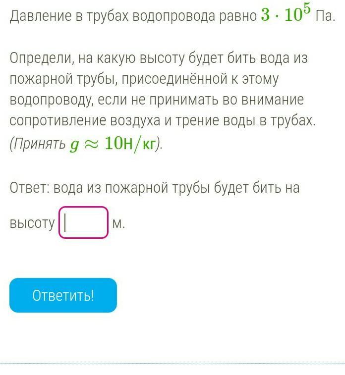 p=po*g*h, h=p/po*g=3*10^5 Па/1000 кг/м^3*10 Н/кг=30 м
