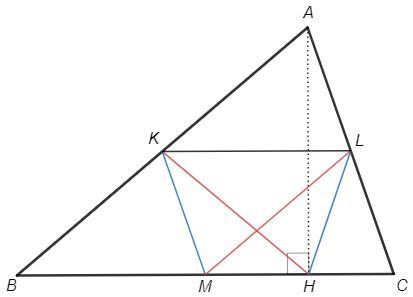 Т.к. КL средняя линия , то АО=ОН ⇒ КL- серединный перпендикуляр , каждая точка которого равноудалена от концов отрезка АН. Поэтому КА=КН и LA=LH ⇒