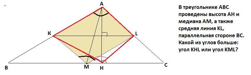 В треугольнике ABC проведены высота AH и медиана AM, а также средняя линия KL, параллельная стороне BC. Какой из углов больше: