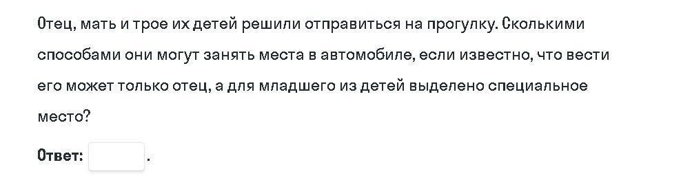На первом месте может быть только 1 член семьи (отец, так как только он водит), на втором месте может быть так же только 1 член семьи (только младший ребенок, так как ему необходимо специальное место), на третье место могут сесть один из 3 человек (мать или кто-то из двоих старших детей), на четвертое место может сесть кто-то из 2 человек, которые ещё не сели, и на последнее место – 1 оставшийся член семьи.