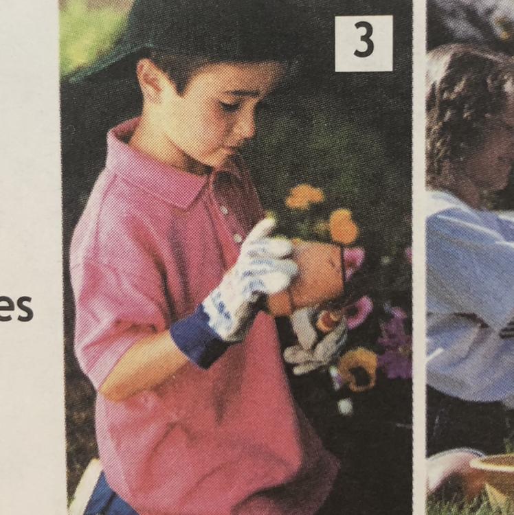 The boy is planting flower. He is wearing pink shirt, cap. He has dark fair. He is about 6 or 7 years old.