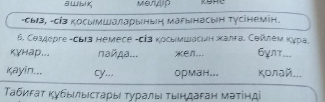 құнарсыз, Қауіпсіз,пайдасыз, сусыз, желсіз, ормансыз, бұлтсыз, қолайсыз