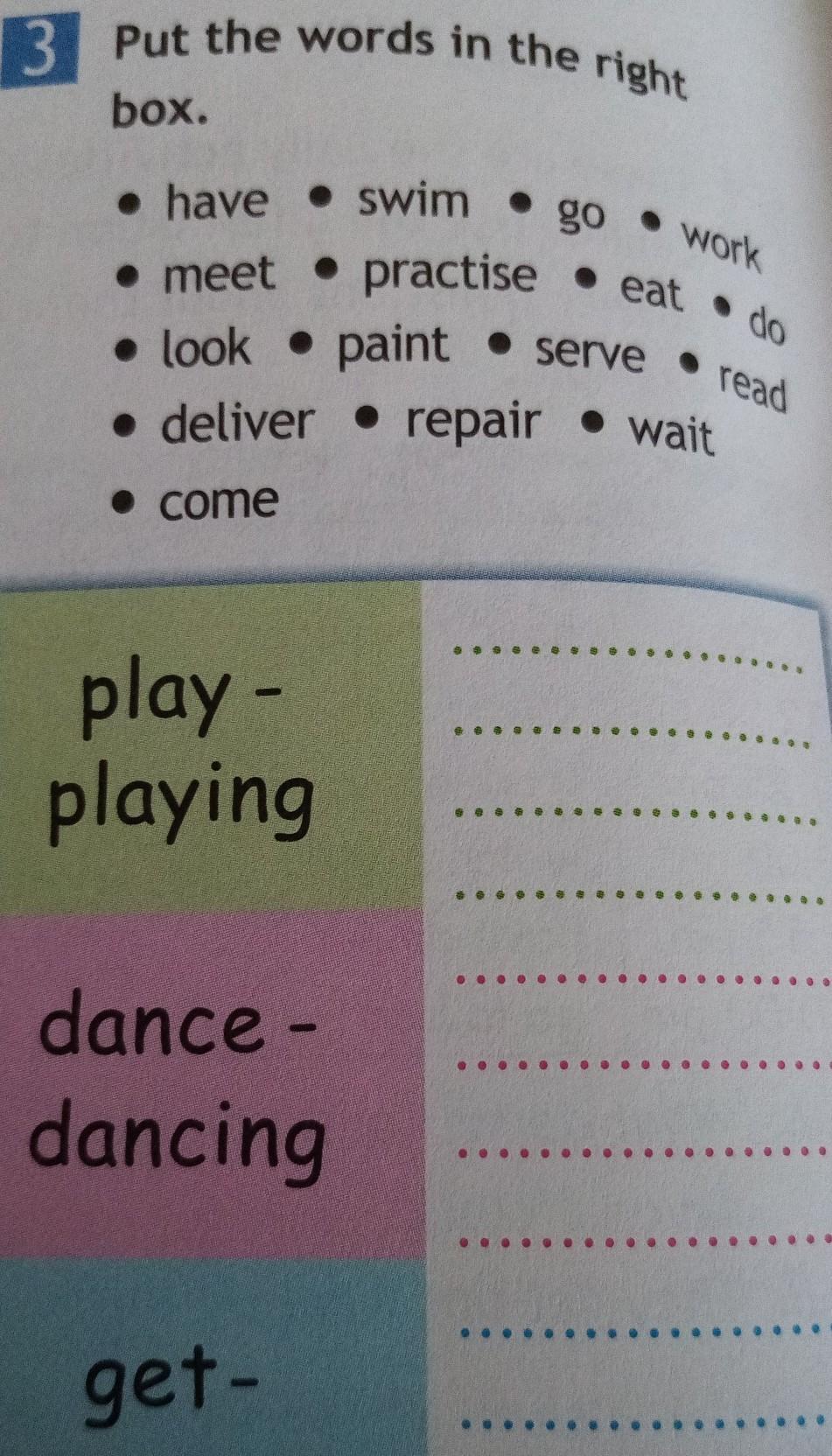 have -having swim -swimming go-going work - working meet-meeting practise - practising eat-eating do-doing look-looking paint-painting serve-serving read-reading deliver-delivering repair-repairing wait-waiting come-coming
