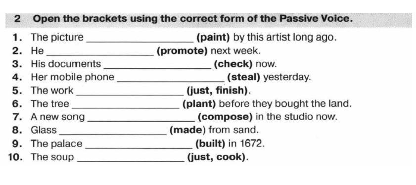 1. was painted 2 will be promoted 3 are being checked 4 was stolen 5 has just been finished 6 had been painted 7 has being composed 8 is made 9 was built 10. has just been cooked