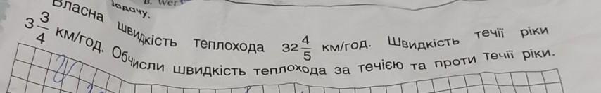 2) 32 4/5 - 3 3/4 = 29 1/20 (км/год.) - швидкість теплохода проти течії.