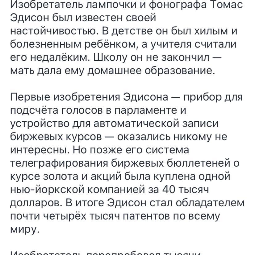 Изобретатель лампочки и фонографа Томас Эдисон был известен своей настойчивостью. В детстве он был хилым и болезненным ребёнком, а учителя считали его недалёким. Школу он не закончил — мать дала ему домашнее образование.