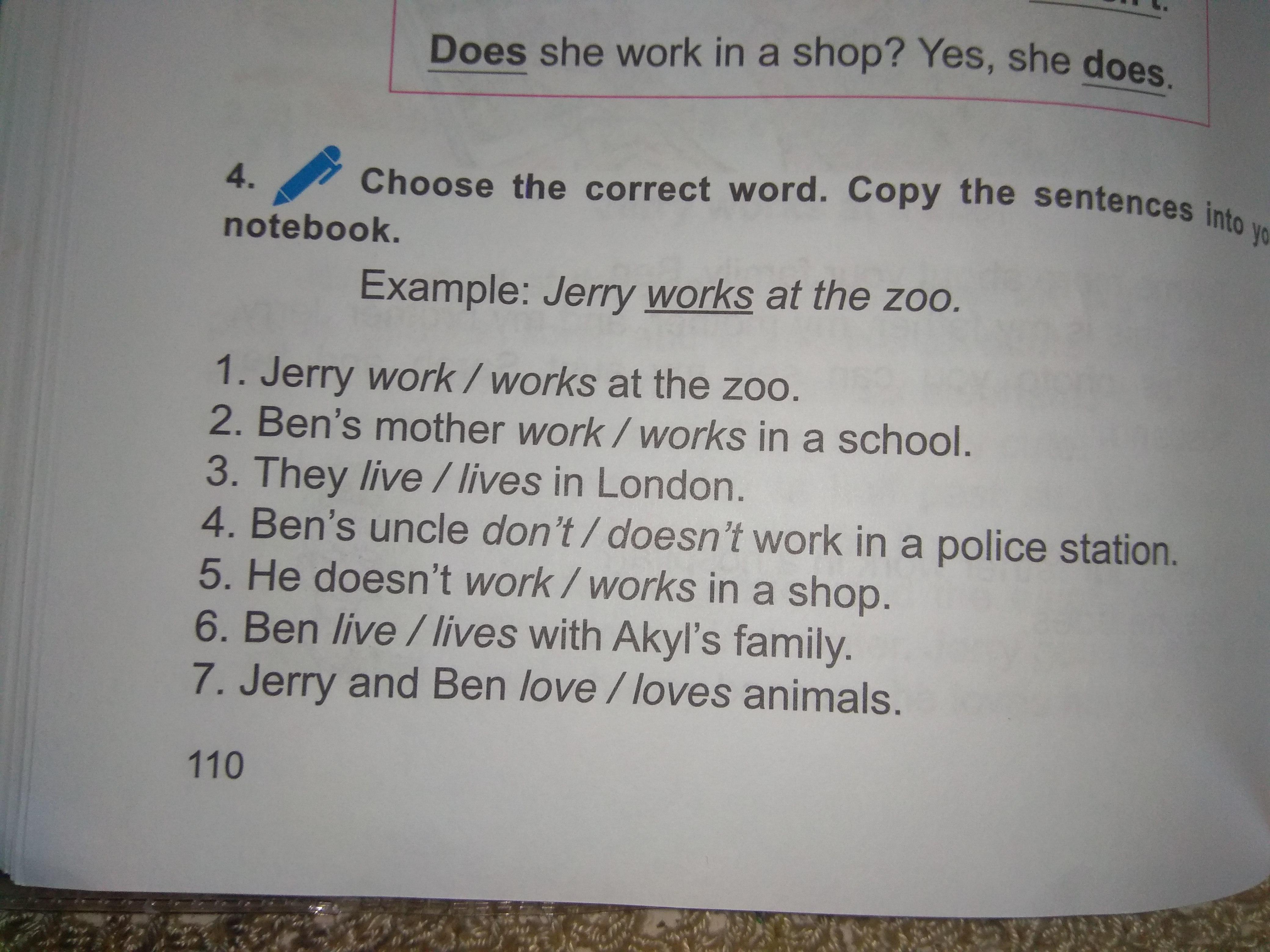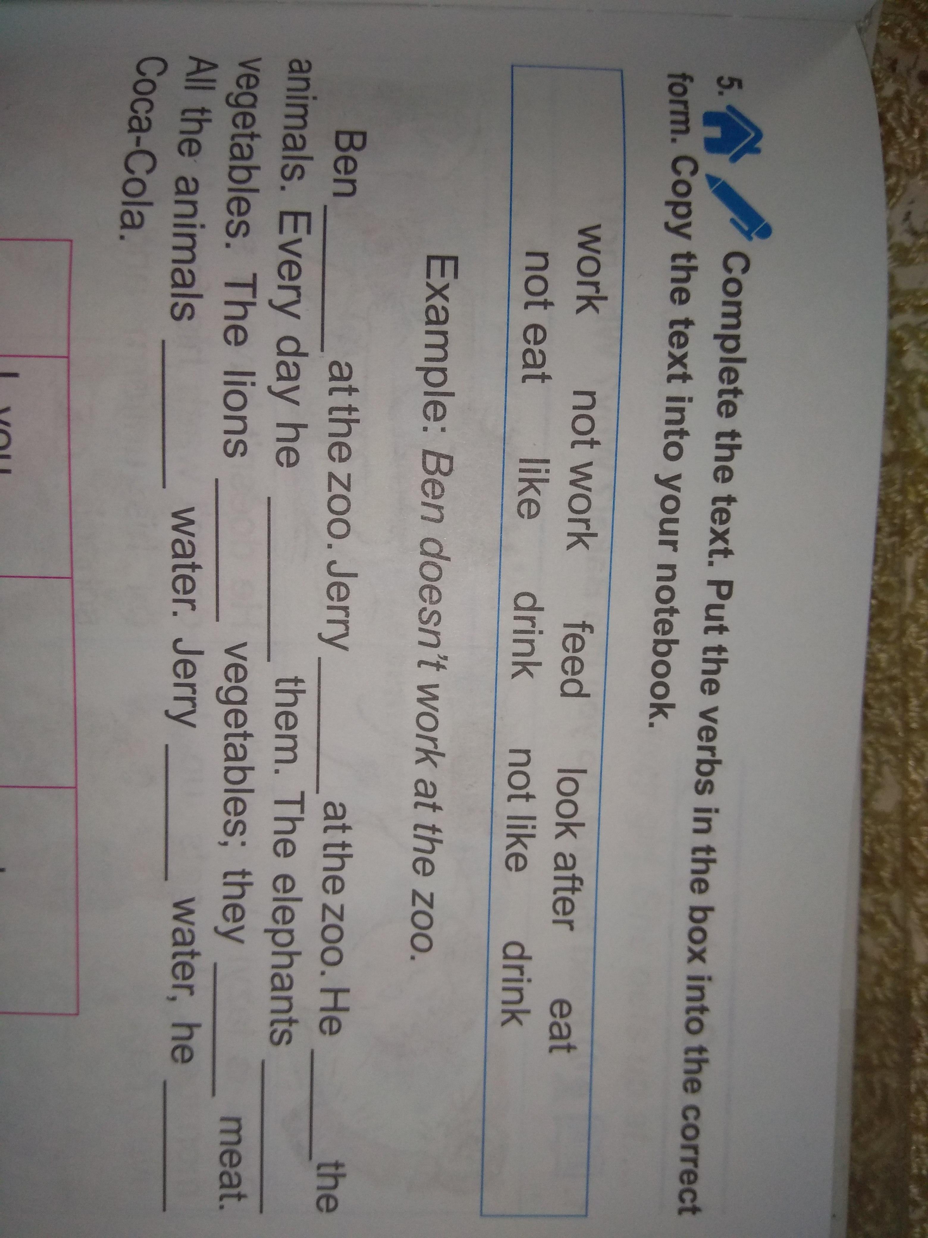 Ben doesnt work at the zoo. Jerry works at zoo. He looks after the animals. Every day he feeds them. The elephants eat vegetables. The lions doesnt eat vegetables, they like meat. All the animals drink water. Jerry doesnt like water, he likes Coca-Cola