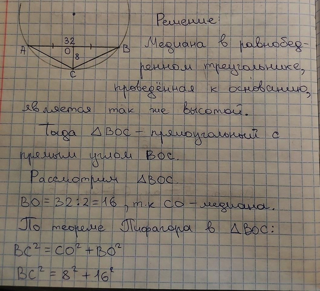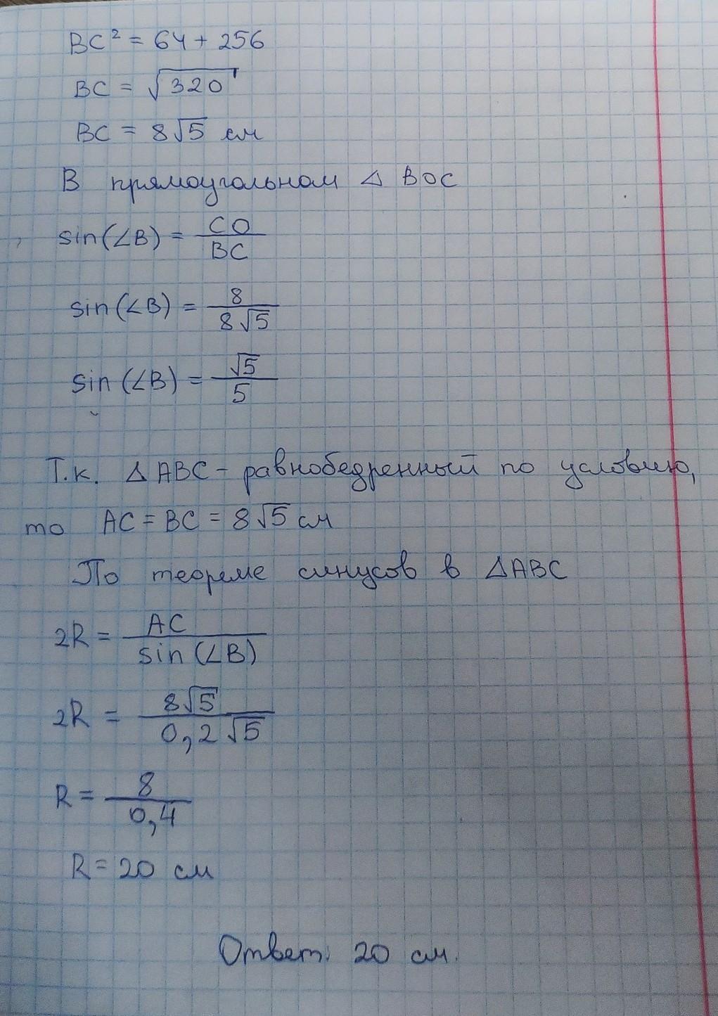 знайти радіус кола описаного навколо рівнобедреного трикутника основа якого дорівнює 32см а медіана проведена до основи дорівню 8 см