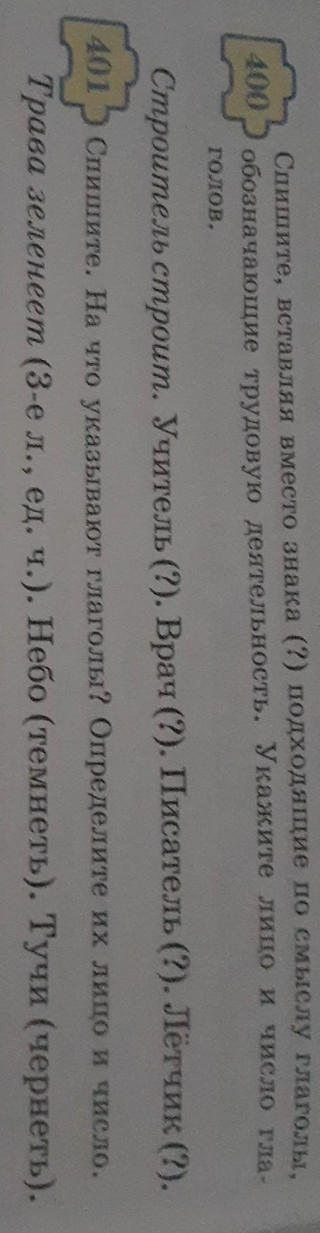 Учитель учит (3-е л., ед. ч.), врач лечит (3-е л., ед. ч.), писатель пишет (3-е лицо, ед. ч.), лётчик летает (3-е л., ед. ч.).