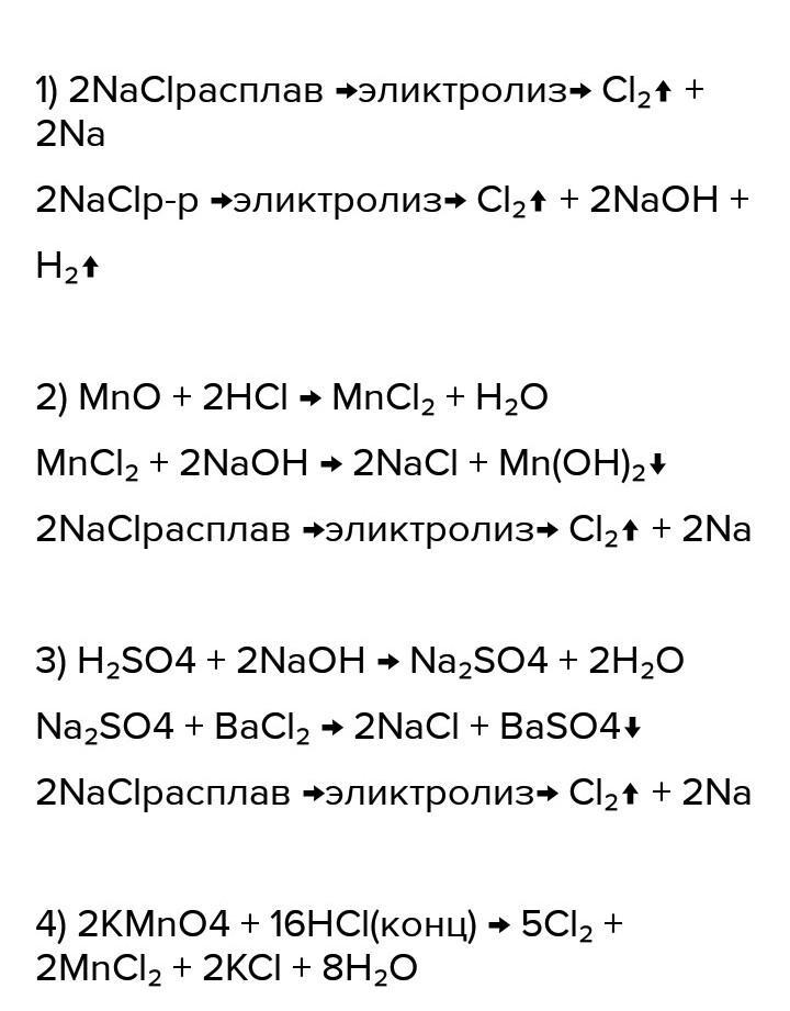 сколько ми способами можно получить хлор используя следующие вещества:NaCl, MnO2 , H2SO4, KMnO4? Запишите уравнения реакций