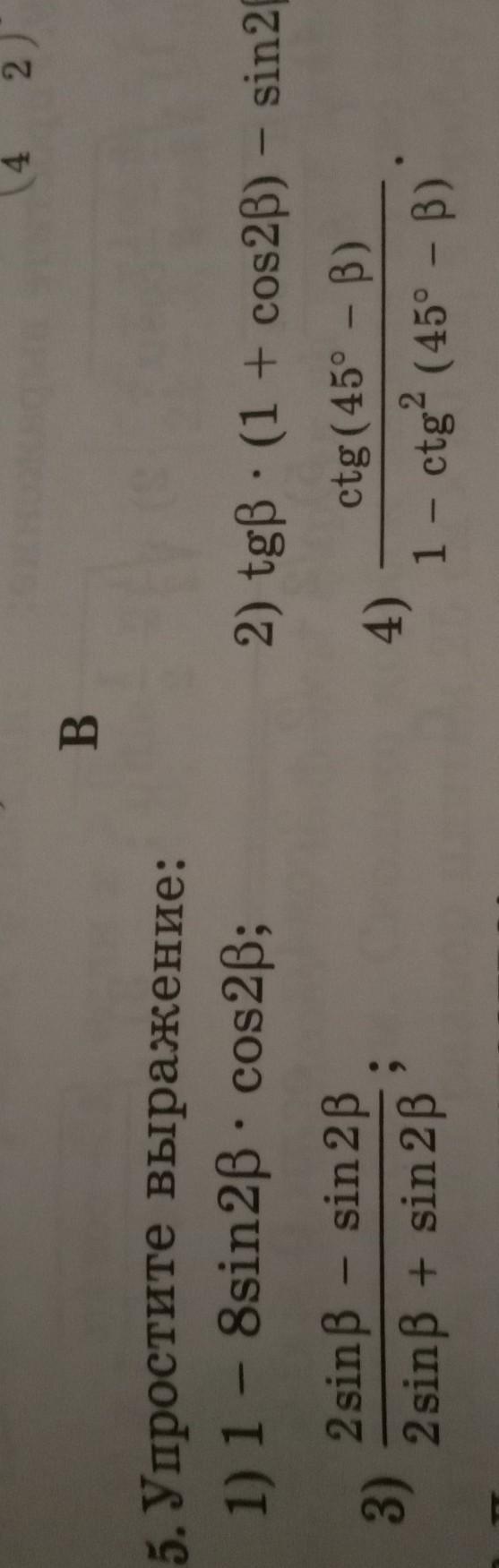 г) ctg(45°-β)/1 - ctg²(45°-β) = ctg 45° × ctgβ +1/ctgβ - ctg 45° / 1 - (ctg 45° × ctgβ +1/ctgβ - ctg 45°)² = cotβ+1/ctgβ-1 / 1-(ctgβ+1/ctgβ-1)² = cotβ+1/ctgβ-1 / 1- (ctgβ+1)²/(ctgβ-1)² = cotβ+1/ctgβ-1 / (ctgβ-1)²-ctg(β+1)²/(ctgβ-1)² = cotβ+1/ctgβ-1 / -2×2ctgβ/(ctgβ-1)² = cotβ+1/ctgβ-1 / -4ctgβ/(ctgβ-1)² = - cotβ+1/ctgβ-1 / 4ctgβ/(ctgβ-1)² = - cotβ+1/ctgβ-1 × (ctgβ-1)²/4ctgβ = - (cotβ+1)×(ctgβ-1)/4ctgβ = - ctg²β-1/4ctgβ = 1-ctg²β/4ctgβ