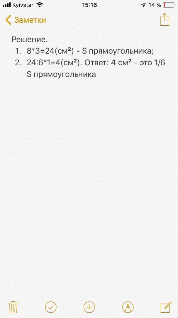 2) 24 : 6 *1 = 4 (кв.см) 1 шестая площади прямоугольника