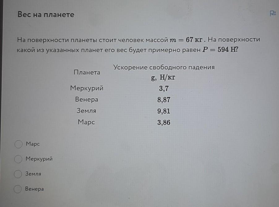 На поверхности планеты стоит человек массой m=67 кг. на поверхности какой из указанных планет его вес будет примерно равен P=594 H?