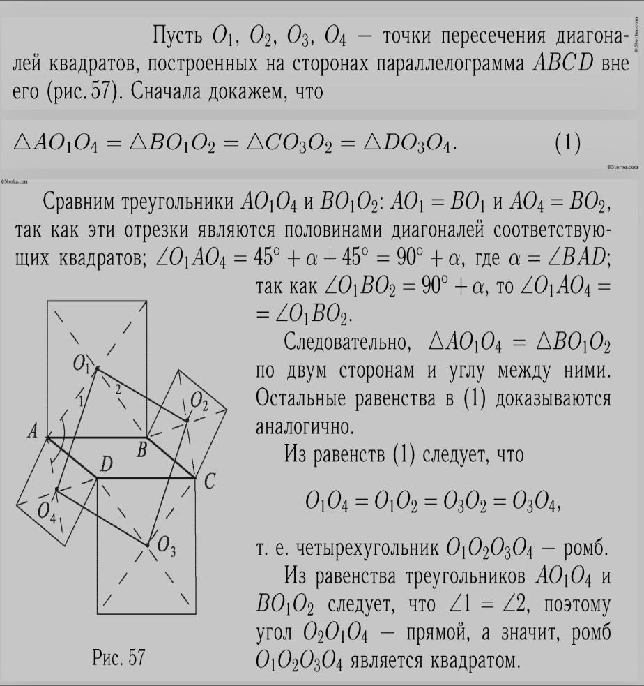 На сторонах параллелограмма вне его построены квадраты. Докажите, что точки пересечения диагоналей квадратов являются вершинами одного квадрата.