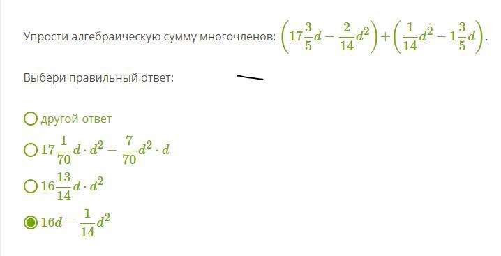 Упрости алгебраическую сумму многочленов: (1735d−214d2)+(114d2−135d)