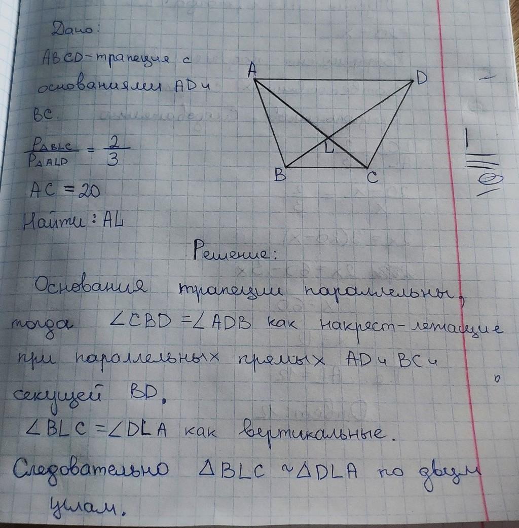 1.Диагонали трапеции ABCD с основаниями AD и ВС пересекаются в точке L Периметры треугольников BFC и ALD относятся как 2 : 3, AC = 20. Найдите длину отрезка AL.