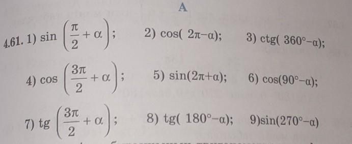 1)Sin(\frac{\pi }{2}+\alpha)=Cos\alpha\\\\2)Cos(2\pi-\alpha)=Cos\alpha\\\\3)Ctg(360^{0} -\alpha)=-Ctg\alpha\\\\4)Cos(\frac{3\pi }{2}+\alpha)=Sin\alpha\\\\5)Sin(2\pi+\alpha)=Sin\alpha\\\\6)Cos(90^{0}-\alpha)=Sin\alpha\\\\7)tg(\frac{3\pi }{2}+\alpha)=-Ctg\alpha\\\\8)tg(180^{0} -\alpha)=-tg\alpha\\\\9)Sin(270^{0}-\alpha)=-Cos\alpha