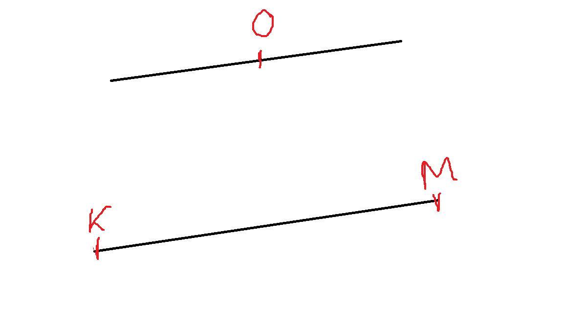 начерти отрезок, отметь на нём точки К и М. Дальше, поставь точку О, но не на отрезке, а где то над отрезком. Проведи отрезок у точки О.
