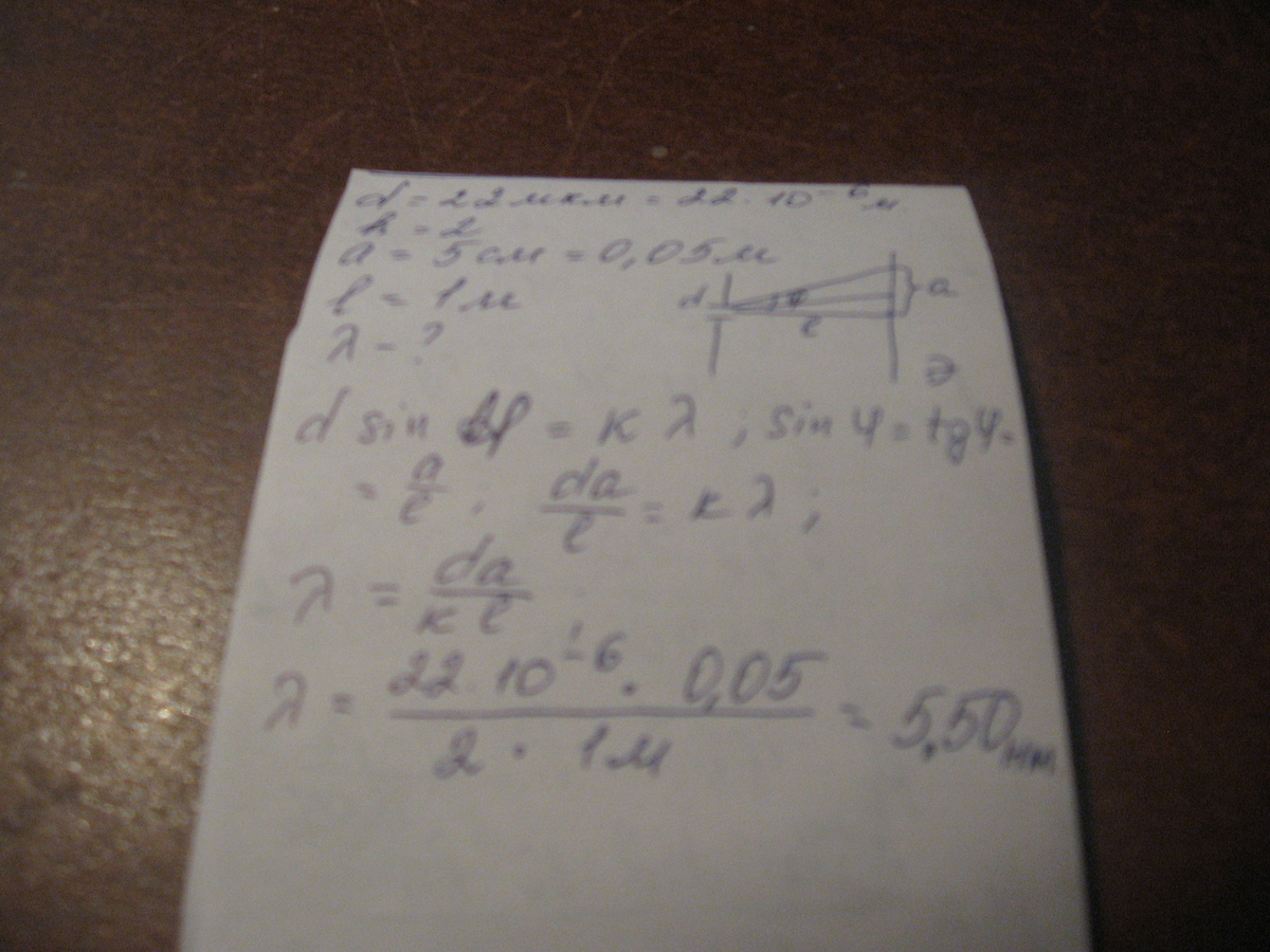 Спектр получен с помощью дифракционной решетки с периодом 22 мкм. Дифракционный максимум второго порядка находится на расстоянии 5 см от центрального и на расстоянии 1 м от решетки. Определите длину световой волны. При расчетах примите sinφ ≈ tg φ. Ответ выразите в нанометрах и занесите в таблицу ответов только числовое значение.