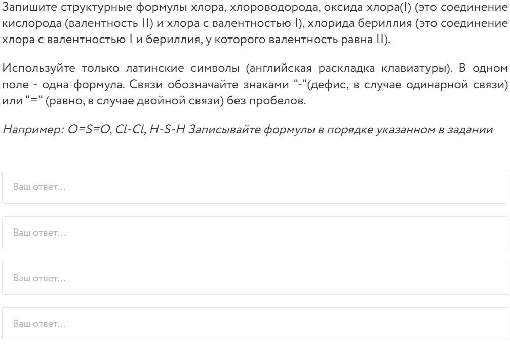 Запишите структурные формулы хлора, хлороводорода, оксида хлора(I) (это соединение кислорода (валентность II) и хлора с валентностью I), хлорида бериллия (это соединение хлора с валентностью I и бериллия, у которого валентность равна II).