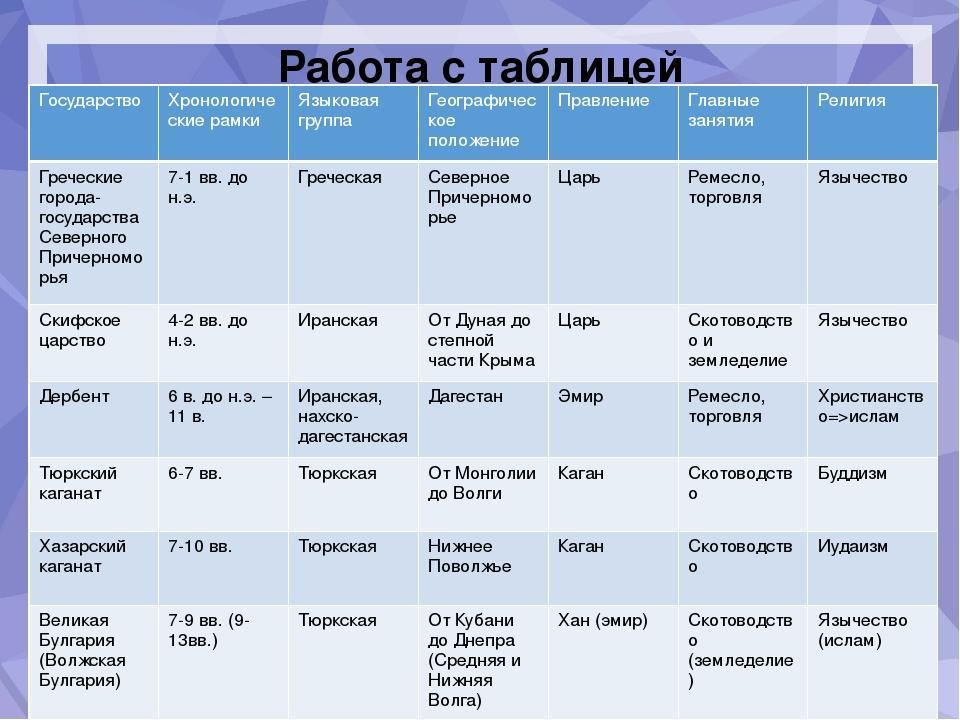 Заполнить таблицу "Образование первых государств" (Название государства, хронология, место расположения)