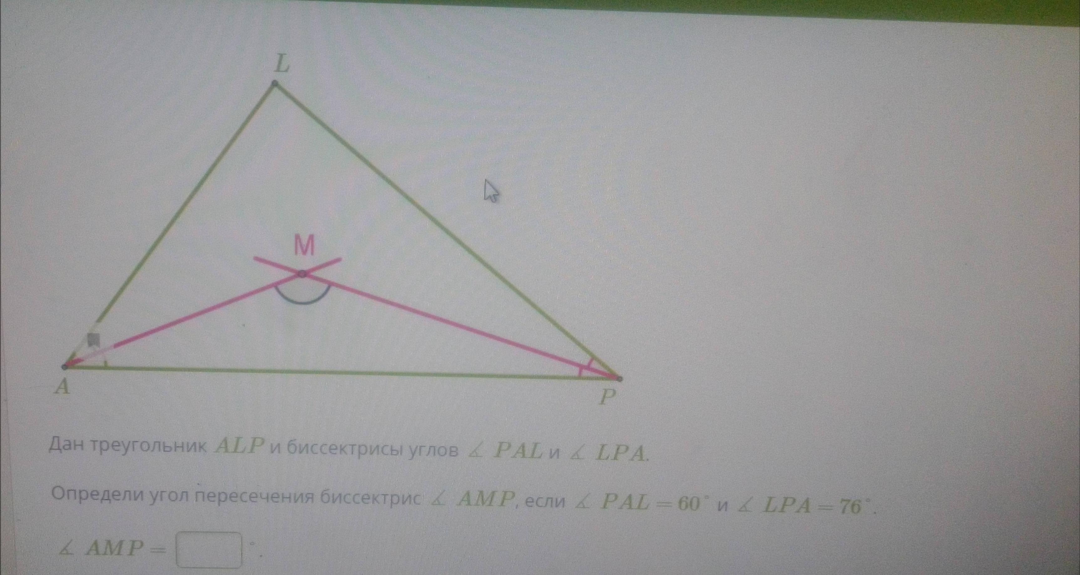 биссектриса делит угол пополам, значит MAP=60°:2=30°, APM=76°:2=38°,