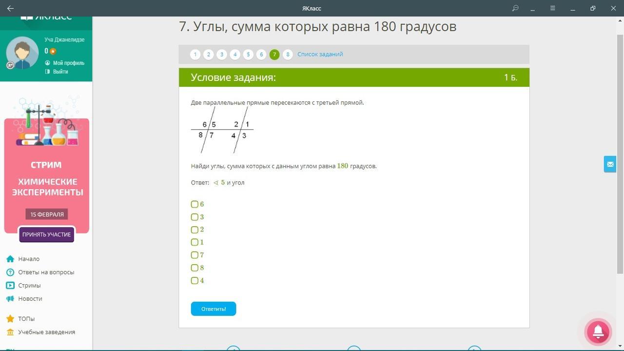 углы 6 и 5 смежные, углы 7 и 5 смежные, углы 2 и 5 односторонние