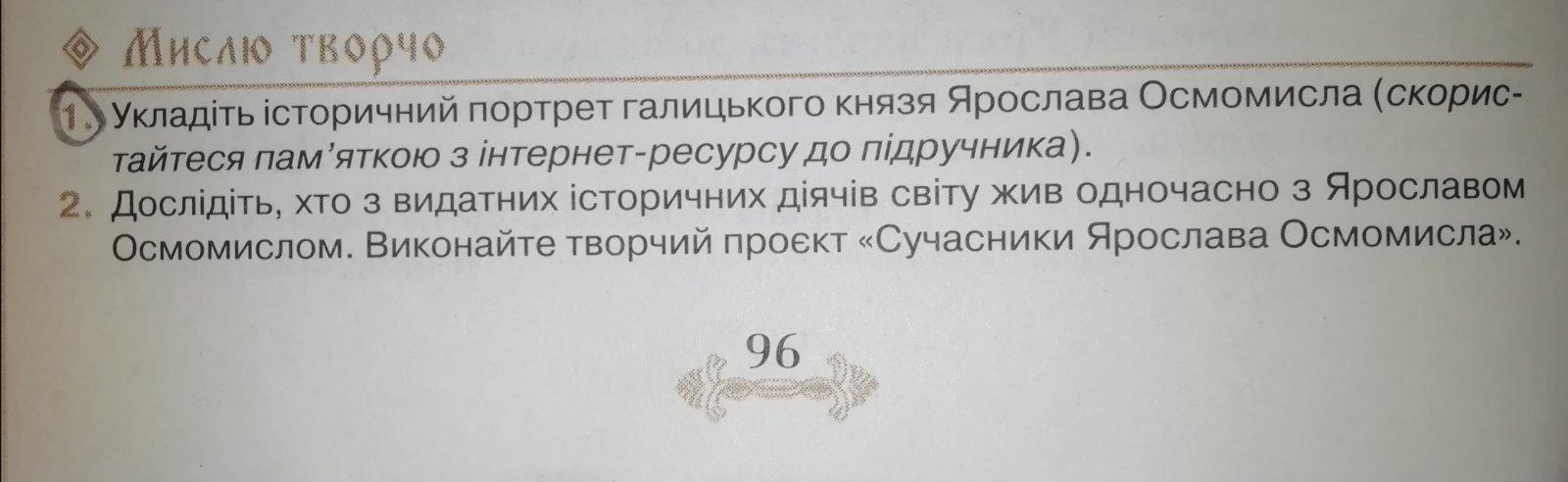 Ярослав Осмомисл (30-ті рр. 12 ст. - 18.ІХ(І.Х.) 1187 - князьгалицький (1153-1187), військовий та політичний діяч, син Володимирка. Ярослав Осмомисл, приєднав до свого князівства землі між Дністром і Карпатами, пониззя Дунаю. Внутрішня політика Ярослава Осмомислова була спрямована на боротьбу з боярством, яке у той час вже перетворилося на родову аристократію з військовими дружинами і почало втручатися не тільки в державні, але і приватні справи князя. Мав добрі стосунки з Угорщиною. Був одним з найбільш впливовіших князів в боротьбі за великокняжий престол.
