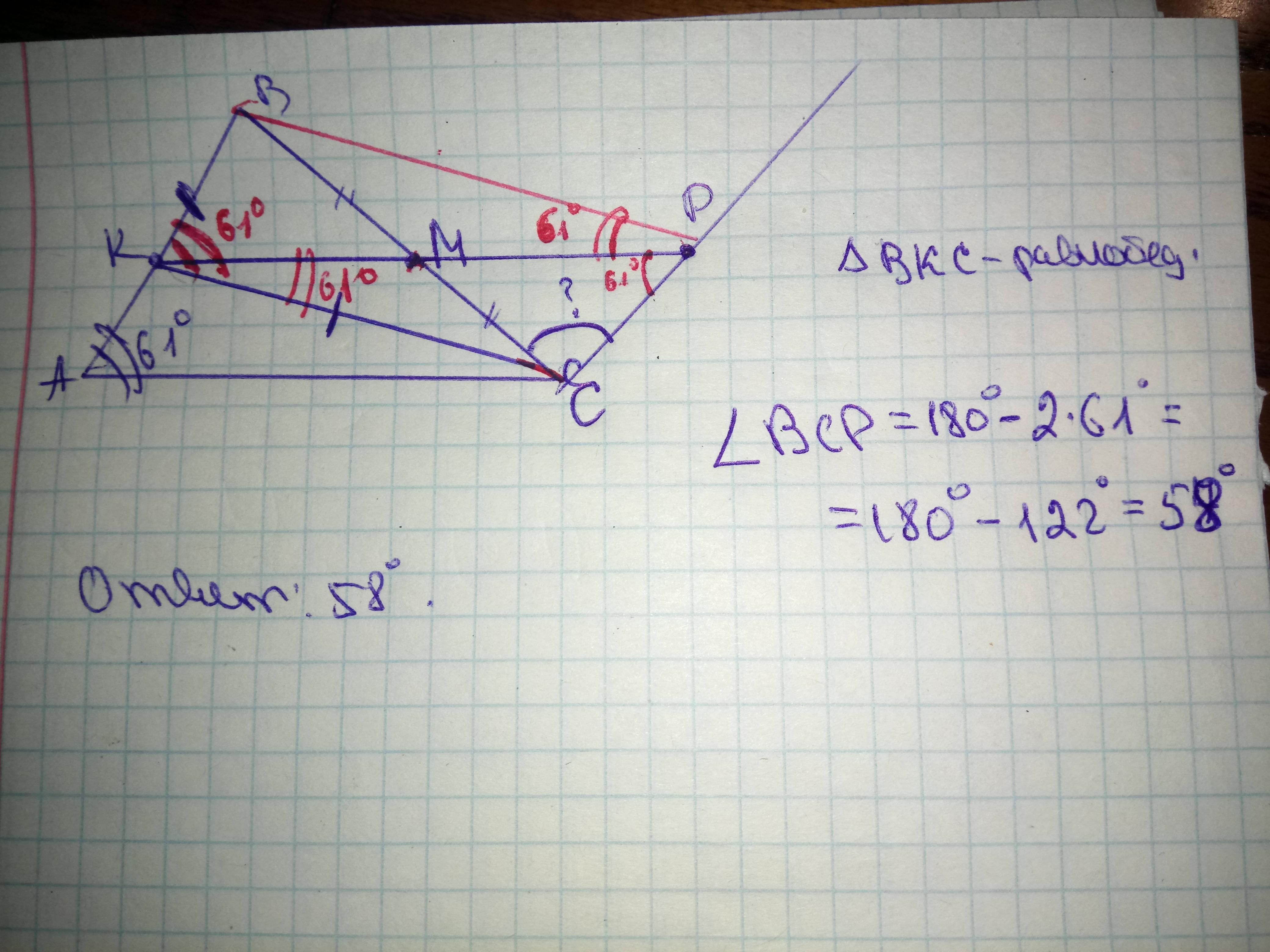 луче КМ за точку м отложен отрезок MP = MK. Найдите угол ВСР, если ВК = CK, угол A =