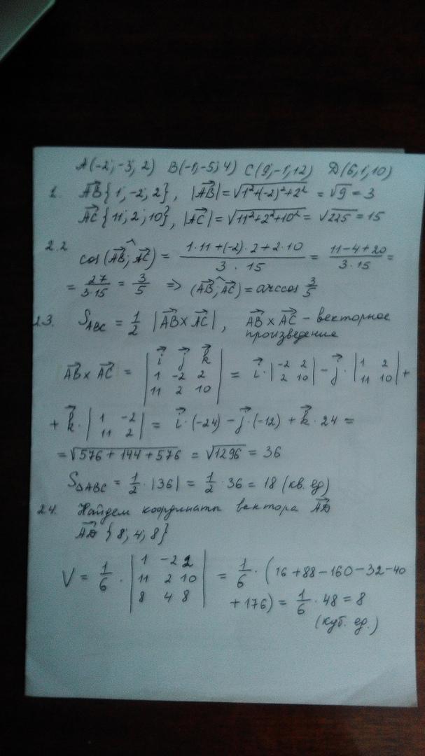 1. Записать координаты векторов AB и AC и найти модули этих векторов;