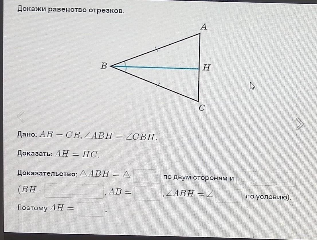 BH- общая сторона, AB = BC, ∠ABH = ∠CBH по условию