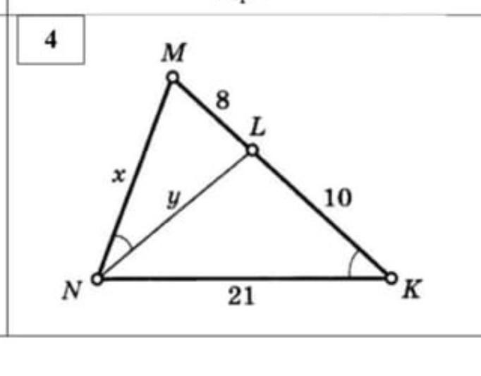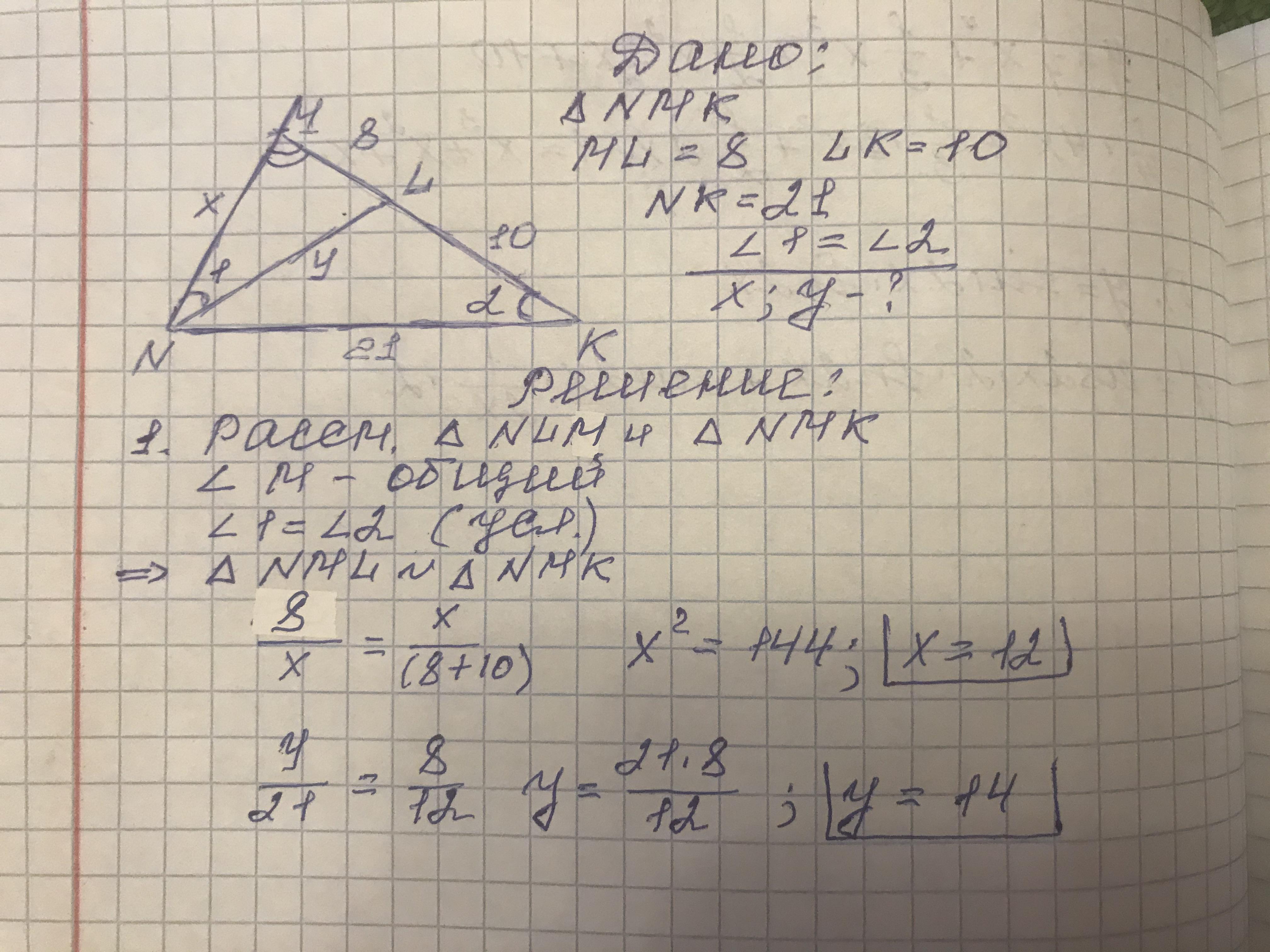 Из подобия треугольников ⇒ frac{x}{10 + 8} = frac{y}{21} = frac{8}{x}