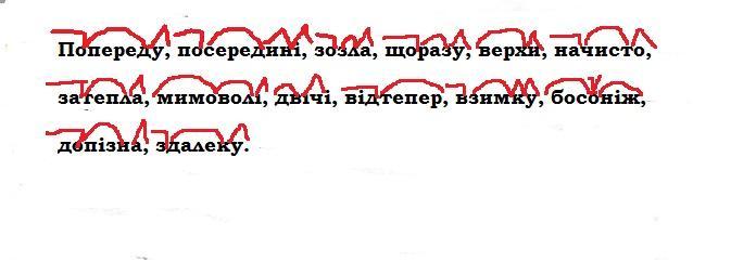 Попереду, посередині, зозла, щоразу, верхи, начисто, затепла, мимоволі, двічі, відтепер, взимку, босоніж, допізна, здалеку.
