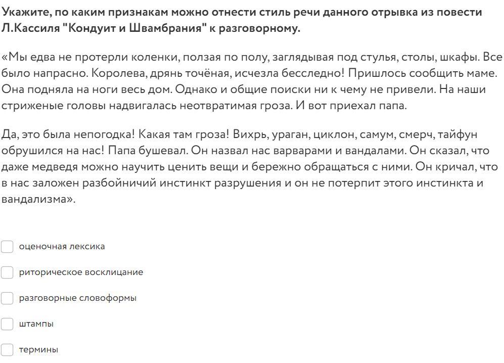 Укажите, по каким признакам можно отнести стиль речи данного отрывка из повести Л.Кассиля "Кондуит и Швамбрания" к разговорному.