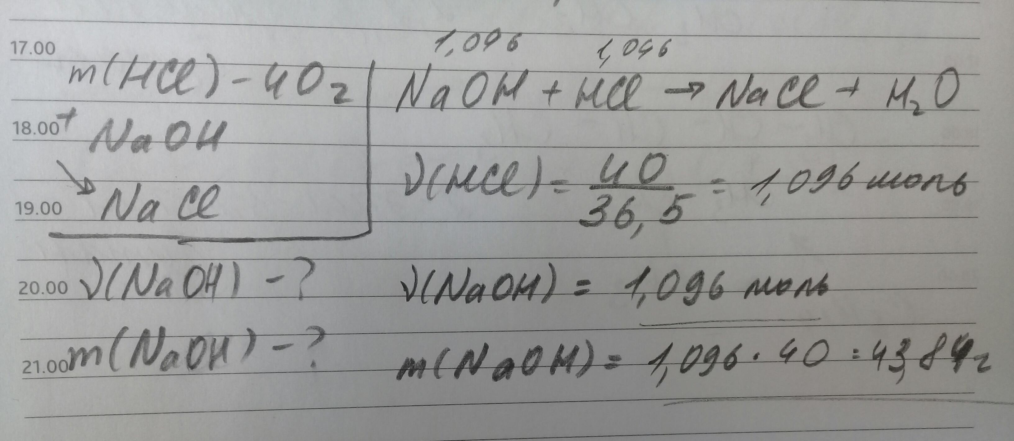 какую массу и количество вещества гидроксида натрия нужно взять для реакции с 40 г соляной кислоты