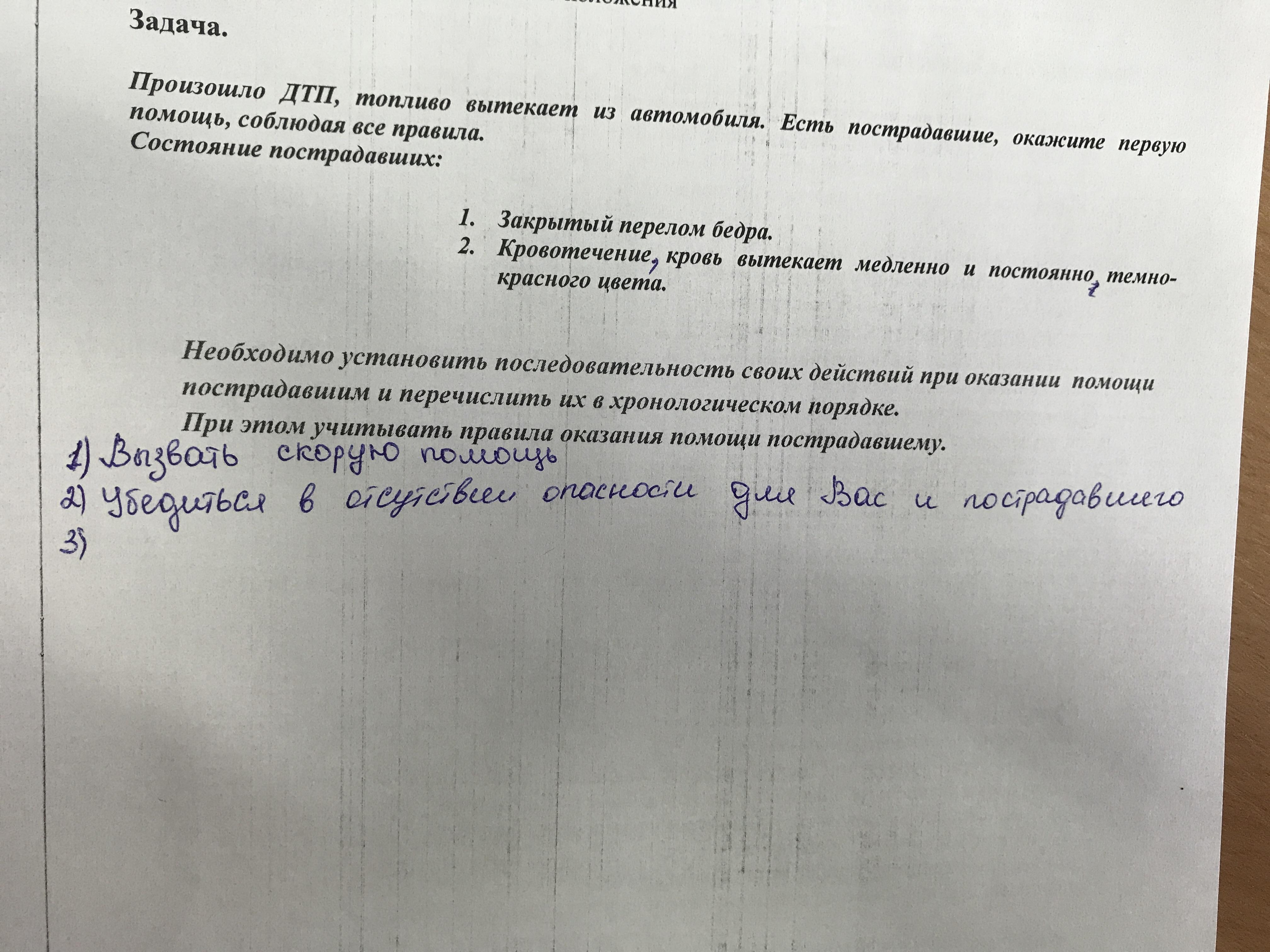 произошло дтп, топливо вытекает из автомобиля. Есть пострадавший, окажите первую мед.помощь, соблюдая все правила. Состояние пострадавшего : 1)«закрытый перелом бедра»,