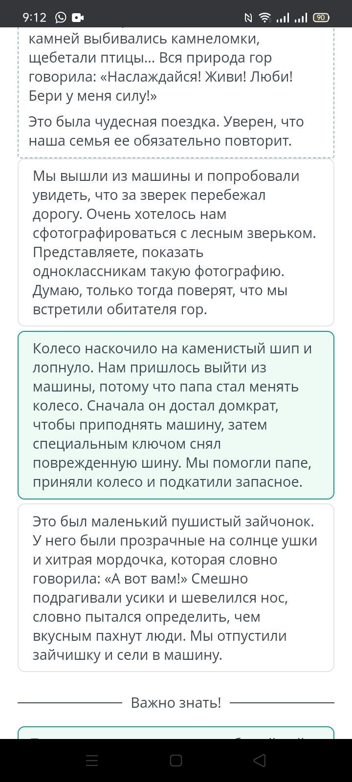 Ответ:Колесо наскочило на каменистый шип и лопнуло. Нам пришлось выйти из машины, потому что папа стал менять колесо. Сначала он достал домкрат, чтобы приподнять машину, затем специальным ключом снял поврежденную шину. Мы помогли папе, приняли колесо и подкатили запасное.